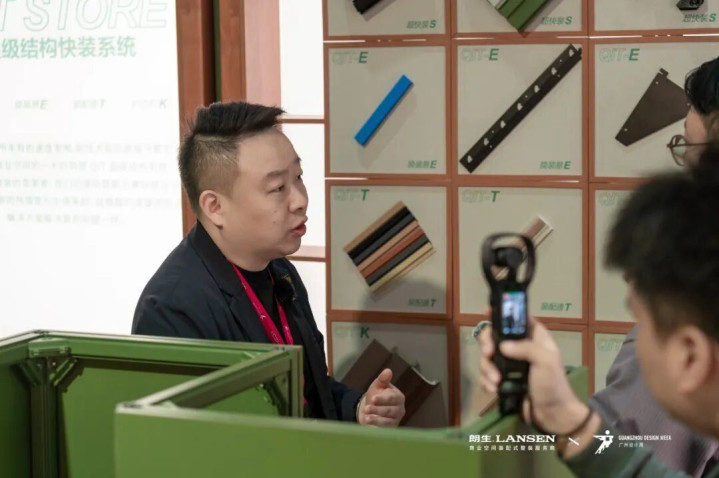 之后,朗生把空间结构纳入考量,将商业场景视为一个大产品,产品内部被拆分成多个标准模块。除了墙板、地板、天花板等硬装,还包括前台、门头、沙发在内的部品,实现高效整店配。目前,基于自主研发的QIT快装结构技术,朗生的连锁整店装系统已升级到了第三代。